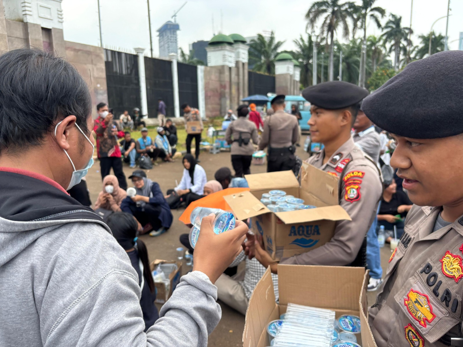 Personel Polwan dan Polki tampak menyusuri kerumunan sambil menyalurkan makanan dan minuman. Masa menyambut dengan antusias dan mengucapkan terima kasih.