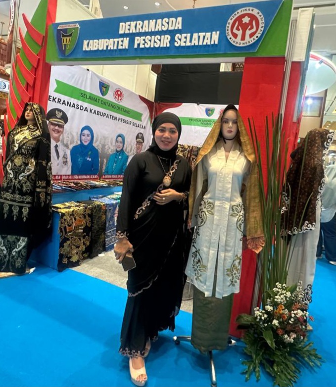 Salah satunya adalah Dekranasda Kabupaten Pesisir Selatan dengan menampilkan produk unggulannya adalah “Sulaman Bayangan Kaligrafi Rozalinda”, dari daerah Barung2 Belantai Pesisir Selatan.